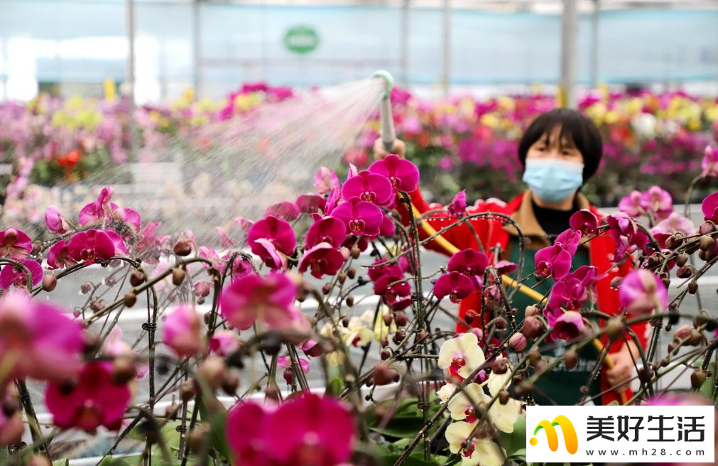 2月18日,山东省滨州市博兴县吕艺镇的花农在给蝴蝶兰浇水。