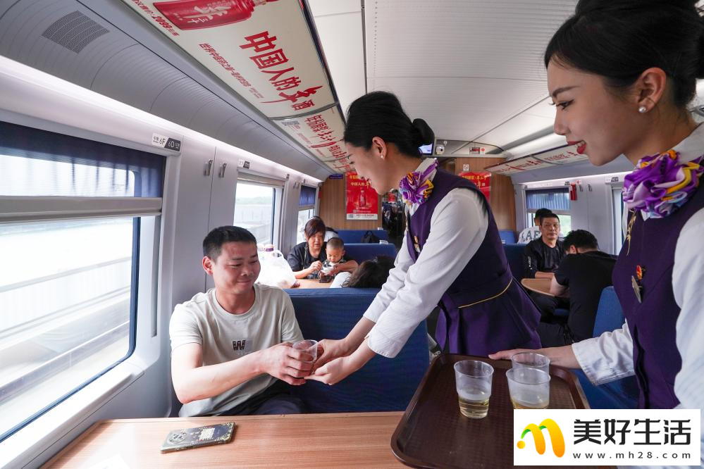 5月20日,南京客运段工作人员在G2807次高铁列车车厢内请旅客品茶。