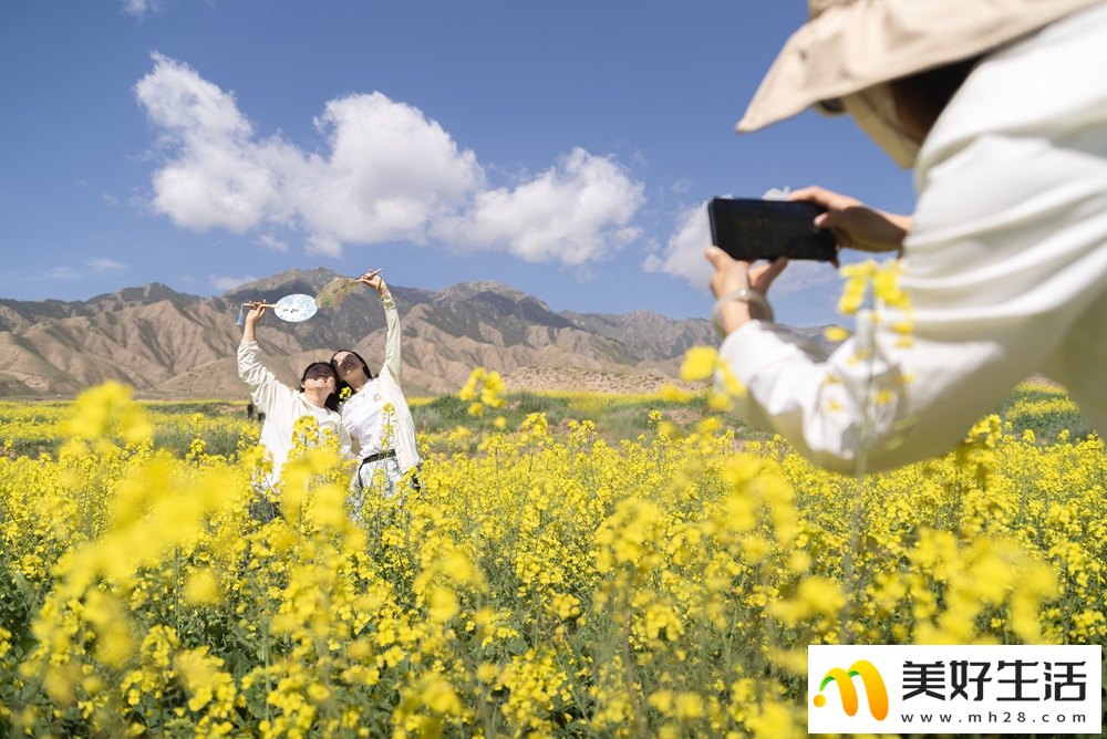近日,张掖市甘州区花寨乡的油菜花进入盛花期,绽放的油菜花与蓝天白云相互映衬,游客置身其中如临画境。新华网发(刘旭明 摄)